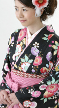 黒地にカラフルな色とりどりの桜の花が印象的な一着。